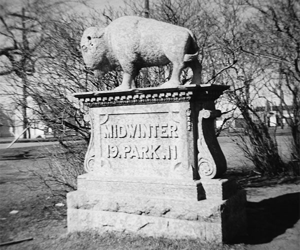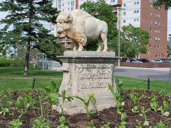 In May 1913, the WPB accepted a $600 bid by the Manitoba Anchor Wire Fence Company to encircle the park with three-foot-high decorative iron fencing. The following year, a bison statue was purchased by Midwinter and donated to the city for placement in his namesake park. The statue and its base were chiseled from limestone quarried at Garson and designed by stonemason Arthur Cox. The pedestal was subsequently inscribed with the park name and the original year of renaming, after which it was erected in the park.