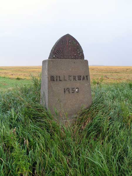 A monument in the Municipality of Grassland commemorates the Millerway School District, established formally in June 1883 and allegedly named for founding secretary-treasurer C. W. Miller and its first teacher, Miss Way, who became romantically connected. The district was dissolved in 1912 and its catchment area became part of the Elgin Consolidated School District.