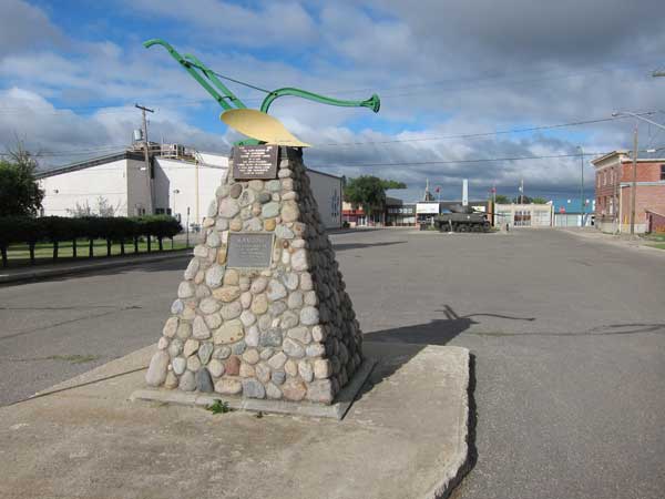 This monument on First Avenue SE in Minnedosa was erected in 1958, on the 75th anniversary of the town, to commemorate pioneers of the surrounding area. In 1983, a plow was added to its top by the Minnedosa Senior Citizens’ Association “to honor the homesteaders whose plows transformed a wild and virgin land into this productive land of plenty.”