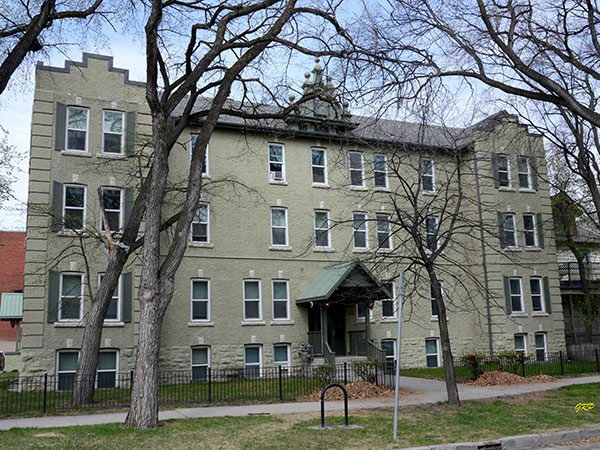 This three-storey apartment block in the West Broadway area of Winnipeg was designed by local architect William Bruce and built in 1910 by George Ephraim Baldry at a cost of $55,000. The 35 by 96 foot building contained 20 apartments. Initially known as the Minnewaska Court, it was renamed the Chateau Apartments around 1937.