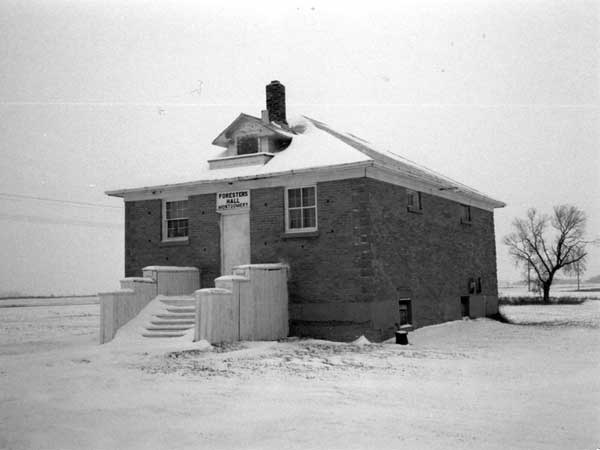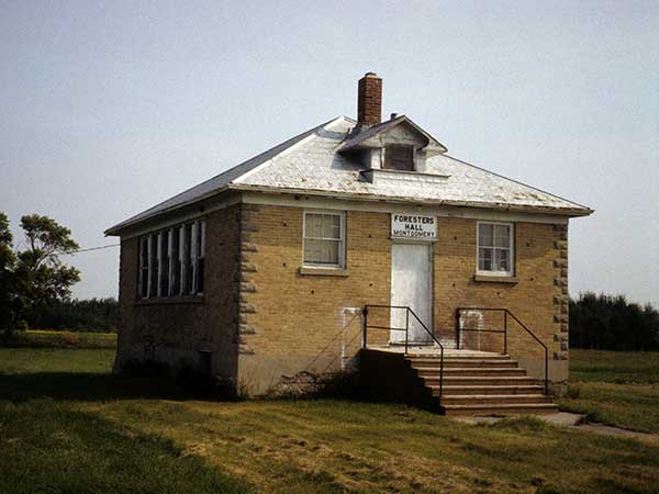 Montgomery School District was formally established in January 1885 with classes held in a frame building on the farm of William Montgomery on the southwest quarter of 22-11-26 west of the Principal Meridian, in what is now the Rural Municipality of Wallace-Woodworth. In 1912, the original building was replaced with a brick structure which was used until January 1965 when the school closed and its remaining students went to Virden Consolidated School No. 144. In 1967, the building was purchased by the local lodge of the Canadian Order of Foresters for use as a hall and community centre. After dissolution of the lodge in 1998, the Wallace Community Club assumed responsibility for the hall. It was demolished in 2005. A brick model and plaque dedicated by former students in 2009 commemorates it.
