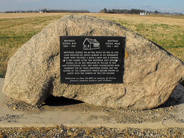 The Montrose School was built on the southeast quarter of 8-12-15 west of the Principal Meridian, in what is now the Municipality of North Cypress-Langford, on land donated by Angus McBean in an agreement with trustees J. Mack, S. Bain, and R. Connor. It was named after the Montrose Post Office. The community became known as Harte with the coming of the Canadian Northern Railway. The school was replaced by another building in 1915, which operated until 1967 when it merged with Carberry Consolidated School No. 2404.