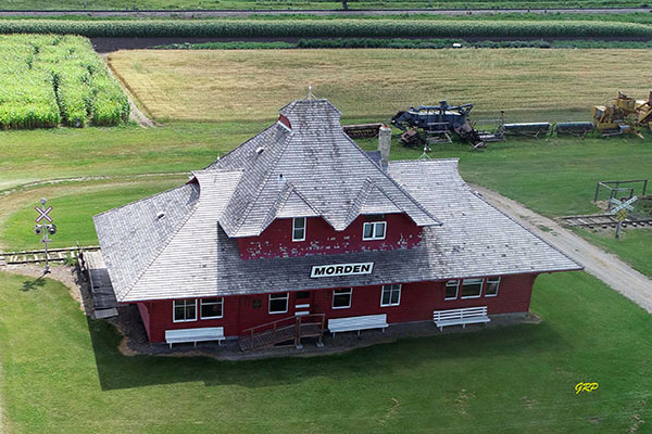 Aerial view of the former Canadian Pacific Railway Station at the Pembina Threshermen’s Museum (August 2020)