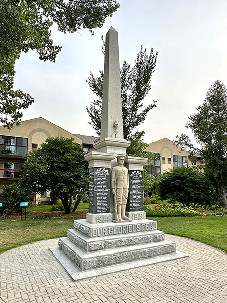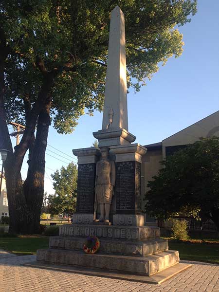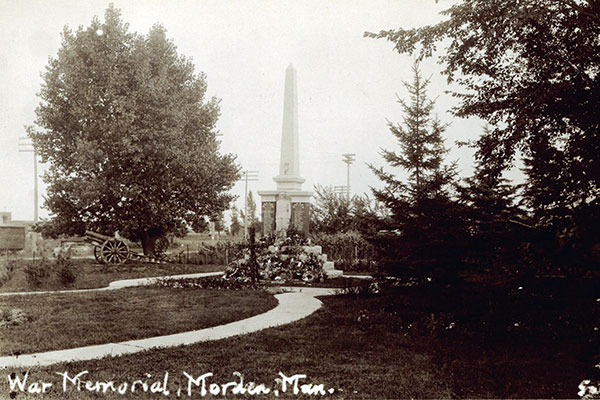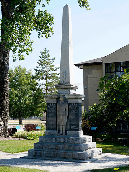 This war memorial, designed by Morden residents Stuart Scott and A. G. Selley, was erected in 1921 by the Town of Morden and the Rural Municipality of Stanley at a cost of $8,000. Originally dedicated in the memory of First World War veterans, the names of Second World War casualties were added in October 1947 and Korean War veterans were added later. Three names, identified during later research, were added in a ceremony on 25 September 2014.