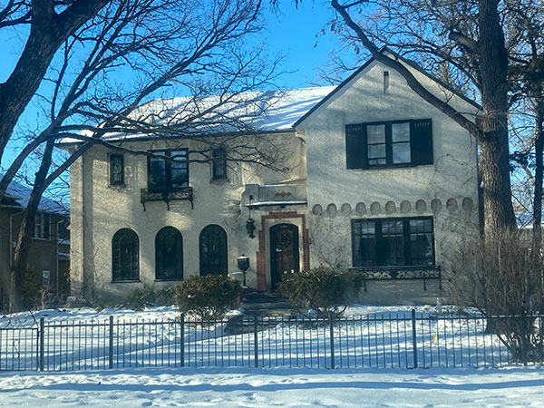 This two-storey, Spanish-style house on Waverley Street in Winnipeg was designed by local architect Max Zev Blankstein and built in 1931 by the Sparrow Brothers for theatre owner Henry Albert Morton. Measuring 48 feet by 52 feet, the house was built at a cost of about $13,000.