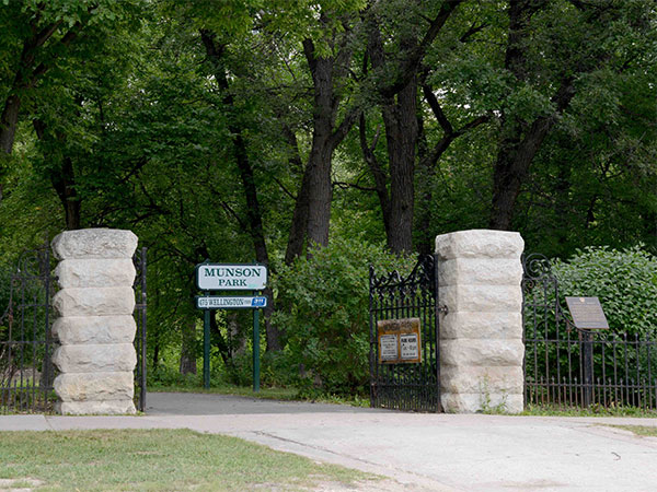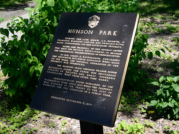 Located on the northeast side of Wellington Crescent in Winnipeg, south of Academy Road, Munson Park is named in commemoration of John Henry Munson, builder of the first house in this area. His home, named “Crescentwood,” would become the name of the neighbourhood. The home was later purchased by James Armstrong Richardson and, in 1976, the land was donated by the Richardson family to the city for development as a public park. It was dedicated on 6 September 1984. A commemorative plaque is situated next to the park gate.