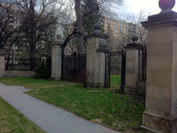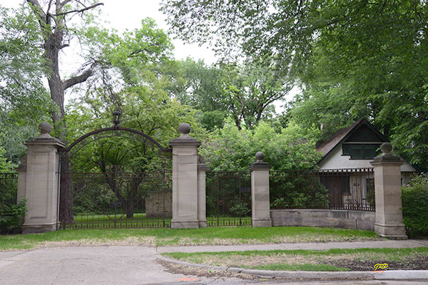 These gates, along with nearby gatehouse and stable (both converted to dwellings), are all that remains of “Kilmorie,” the massive estate of Augustus M. Nanton built in 1900 on this wooded lot south of the Assiniboine River in Winnipeg. Nanton died in 1925 and, after living in the main house for another ten years, his family found it too large to maintain. The building was demolished in 1935 and some of its oak paneling, stone fireplace, fixtures, and hardware were refitted into the gatehouse where Lady Nanton resided until her death in 1942. Subsequent residents in the gatehouse included Rupert Whitehead (1980s) and Rod Zimmer (?-2013). Sold to a developer in 2013, initial plans called for replacement of the deteriorated gatehouse by multi-family development. Local opposition led to a change in ownership of the property and, as of late 2018, modification of the plans toward a more modest duplex building. The gatehouse was demolished in January 2020.
