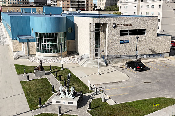 In October 1942, an agreement was reached to sell the complex to the Royal Canadian Navy for $256,000, which would in turn be invested in Victory Bonds. The deal was approved by the Federal Treasury Board in mid-October, and conversion of the building began. Bowling alleys were converted to rifle ranges, the courts were renovated into living quarters, and the ice rinks were re-purposed into training areas. The building became home to the Royal Canadian Naval Reserve headquarters, replacing services and barracks previously based at a cramped site on Ellice Avenue and a recruiting office on Sherbrook Street. It contained areas for administration, training, mess facilities, housing quarters, and space for women’s naval auxiliary activities. The HMCS Chippawa, Canada’s second-largest training ship, was relocated to this site in early January 1943 and it was used for active training of naval personnel though mid-June 1945. The building was opened to the public on 20 November 1943, though renovations and layout so changed that long-time members of the club needed guides to navigate the redesigned premises.