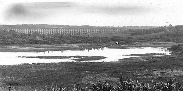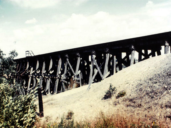 A pile and frame timber railway trestle over Stoney Creek on the abandoned CNR Neepawa Subdivision, originally built by the Canadian Northern Railway, was located about one quarter mile south of the Neepawa town centre, just southwest of Park Lake. Originally nearly 500 feet long and 60 feet high, the northern-most two-thirds of the bridge was covered with earth by 1974. Permission to abandon the line was granted in 1978. Air photos taken in 1981 show the track being torn up and the remaining length of wood trestle being dismantled. The long earth fill on the south end remains very much in evidence. In 1988, the present landowner began to excavate earth from the north side to provide a level site for a new residence.