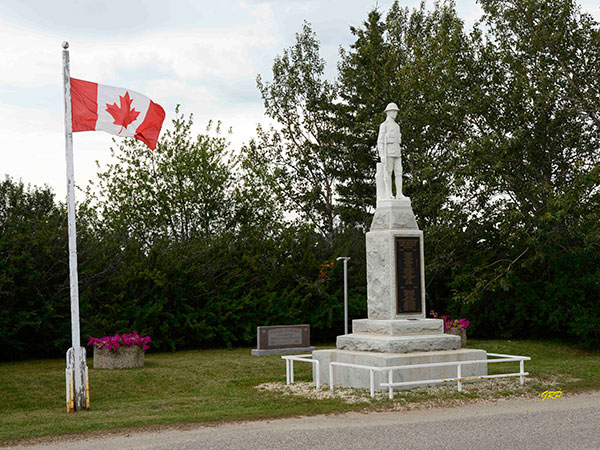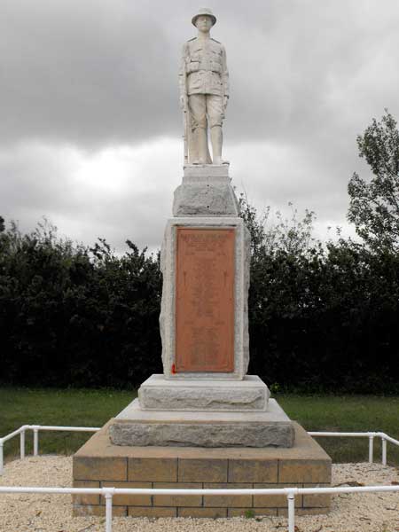 A war memorial at Newdale in the Municipality of Harrison Park was constructed between 1919 and 1920 in memory of the community’s sons killed in the First World War. Unveiled on 17 December 1920 by Lieutenant Governor James Albert Manning Aikins and Brigadier-General Hugh Marshall Dyer, the monument stands 18 feet high, with a base and die of grey granite, surmounted by a life-size statue of a soldier carved in white marble by Signor Nicolai Rombello of Italy. In 1946 a bronze plaque bearing the names of the fallen of both World Wars was placed on the face of the stone.