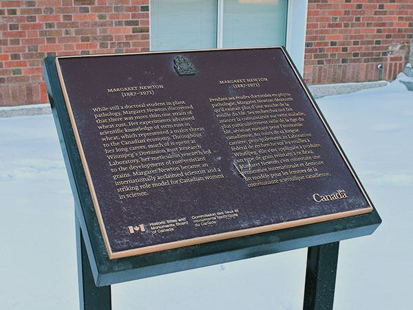 A plaque on the Fort Garry campus of the University of Manitoba, erected in 1996 by the Historic Sites and Monuments Board of Canada, commemorates plant pathologist Margaret Newton, whose ground-breaking research on the rusts of wheat improve our understanding of this threat to the agricultural production of the Canadian prairies.