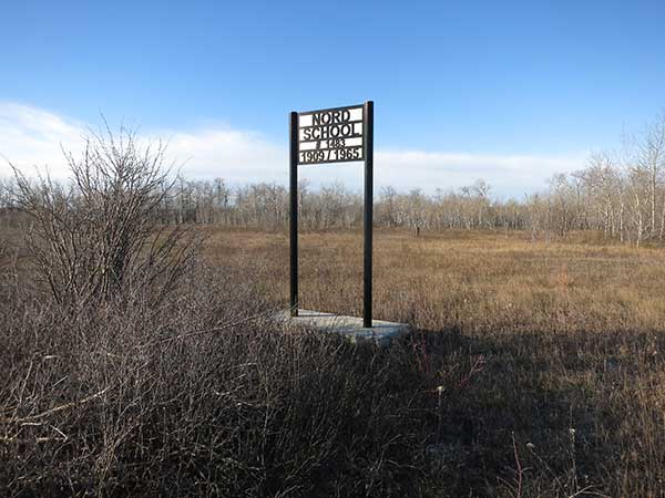 The Nord School District was established formally in March 1909 and a one-room schoolhouse operated at NE16-22-6W, on land donated by J. O. Nord for whom the school was named, in what is now the Municipality of West Interlake. In 1967, the district was dissolved and its catchment area became part of the Lakeshore School Division. The former school building burned in 1978. Its concrete foundation remains at the site along with a commemorative sign.