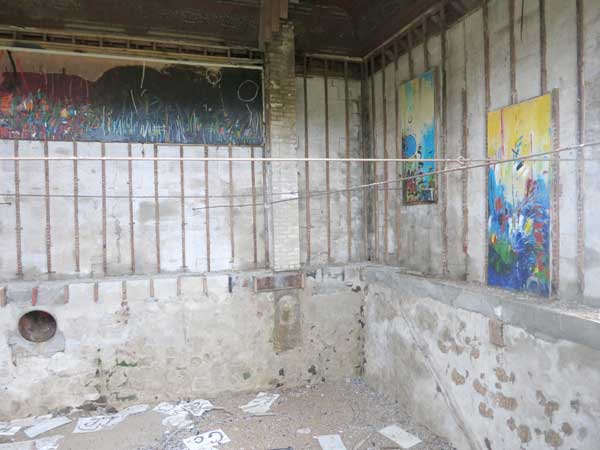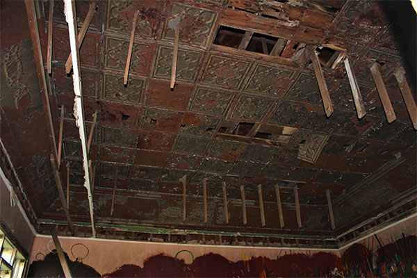 Pressed metal ceiling tiles of the former Northcote School building (August 2019)