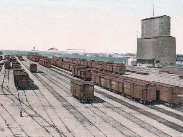 Postcard view of CPR yard and Northern Grain elevator at right (circa 1910)