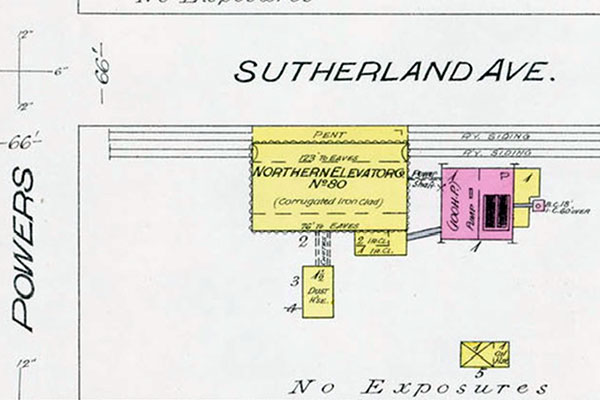 Formerly located at the northwest corner of Sutherland Avenue and Powers Street [no longer a public road], adjacent to the Canadian Pacific Railway yard, in Winnipeg, a 145,000-bushel grain elevator containing 49 internal bins 50 feet deep, was built in 1895 for the Northern Elevator Company. The foundation was subcontracted to the Kelly Brothers and the elevator itself, made of wood covered with corrugated iron, was built by contractors Gordon W. Meldrum and John L. McDougall. They were assisted by the Barnett & Record Company of Minneapolis, Minnesota.