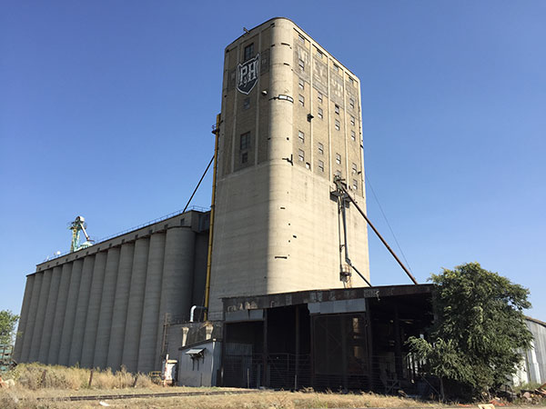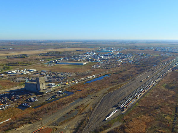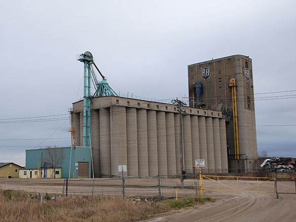 Aerial view of the Parrish & Heimbecker grain elevator alongside the Canadian Pacific Railway tracks (October 2015)