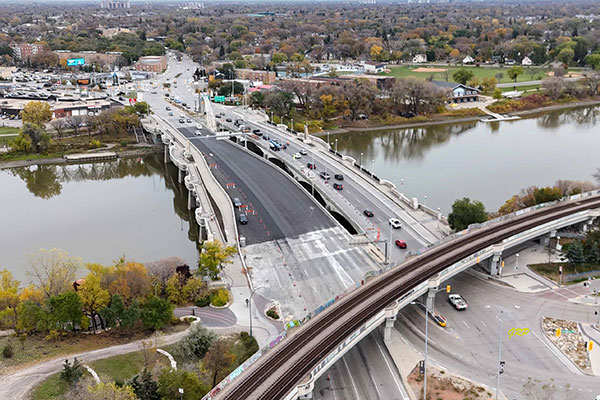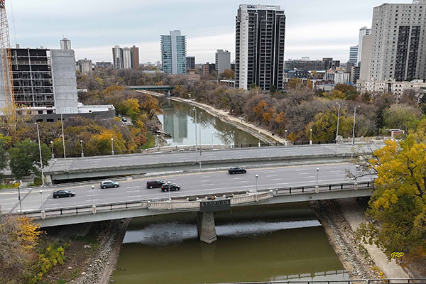 Two identical bronze plaques are located on the St. Boniface side of the Main Street / Norwood Bridge on the east and west spans and describe the official opening of the bridges on 19 October 1999 and the idea behind the design of the River Arch by artist Catherine Widgery.
