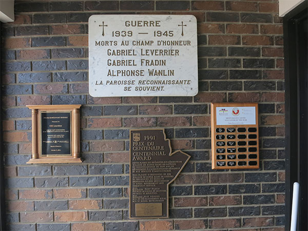 A stone tablet in a municipal office in Notre Dame de Lourdes, in the Municipality of Lorne, commemorates local residents killed during military service in the Second World War.