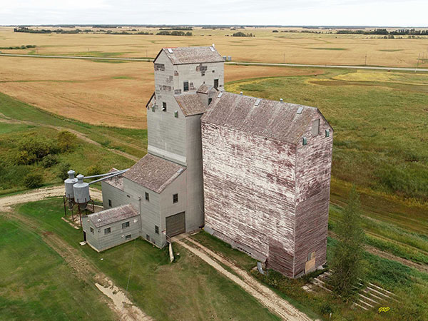 Aerial view of the former Manitoba Pool grain elevator at Oakburn (September 2020)