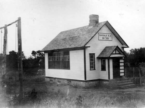 Prior to the formation of Oakdale School District, in May 1892, classes were held in a log cabin. A frame school building was later erected on a hill in the southwest quarter of 15-14-14, west of the Principal Meridian, in what is now the Municipality of North Cypress-Langford. It burned to the ground in the Christmas week of 1918. From January 1919 to June 1921, classes were held in a nearby residence because plans for construction of a new school were delayed while discussion of consolidation with an adjacent school district were underway. In 1921, a new building was constructed and classes resumed. It closed in June 1941. The building was eventually sold and moved to Neepawa for use as a store and office for a farm- and garden-supply business. It later became a horse barn.