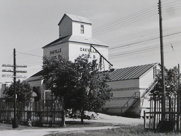 A 34,000-bushel wooden grain elevator on a farm in the Rural Municipality of Portage la Prairie was built at Oakville around 1902 by Ogilvie Flour Mills. An annex was built beside it in 1951, increasing its total capacity to 62,000 bushels. Sold around 1960 to Manitoba Pool Elevators, it became known as “Pool B” at this site. The elevator operated with its own agent until 1972 and was closed in 1975. The building was moved about two miles east of Oakville where it is used for private grain storage. It was demolished in March 2019.