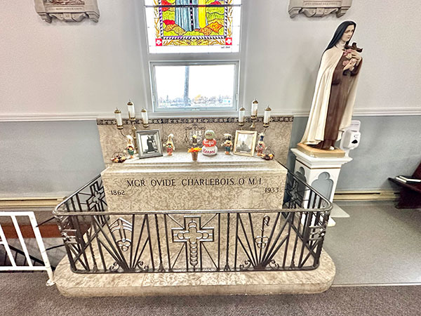 Sarcophagus of Father Ovide Charlebois inside Our Lady of the Sacred Heart Cathedral (September 2023)