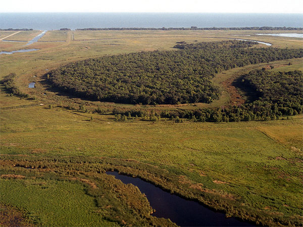 Aerial view of Oxbow Woods looking north toward Lake Manitoba in the background (August 2001)