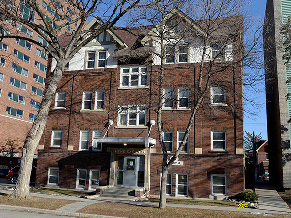This three-storey brick block on Furby Street in Winnipeg, measuring 114 feet by 48 feet, was designed by local architect James William Hawker. It was built in 1928 by the Moxam Construction Company, at a cost of about $65,000 for owner Walter Edwin Rooke. The building contained 22 apartments, each with three or four rooms, in its original configuration. It has 26 now.