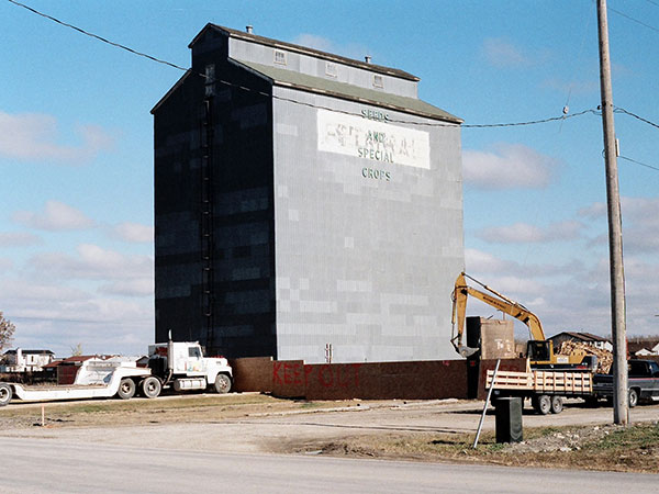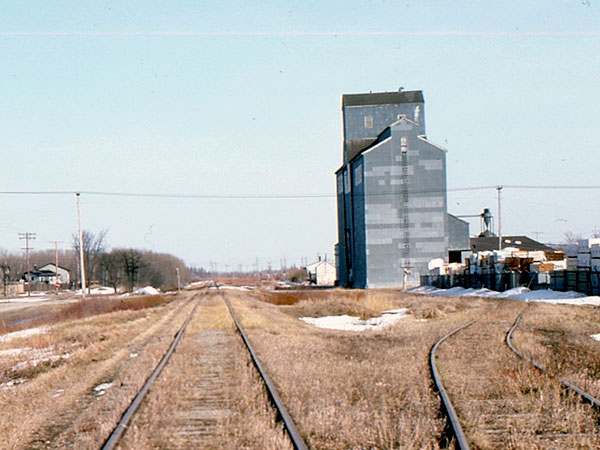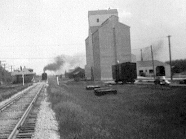 A wooden grain elevator near the station was constructed around 1946 by the Searle Grain Company. Merged with Federal Grain in 1966, the 285,000-bushel elevator, with its two annexes, was sold in 1972 to Manitoba Pool Elevators. It was demolished around 1990.