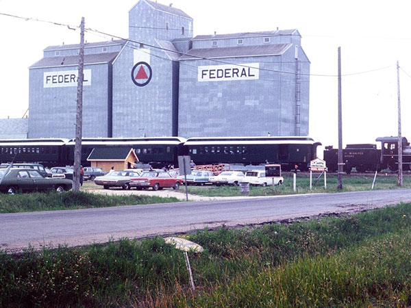View looking south to the Federal Grain elevator in the background and the Prairie Dog locomotive in the foreground (1970)