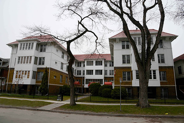 This three-storey brick block on Dorchester Avenue in the Fort Rouge area of Winnipeg was designed by local architect John Simpson Hooper and built in 1912 by contractor William Wardell Cross at a cost of about $77,000. The 99 feet by 117 feet building contained 22 apartments in its original configuration. It contains 25 apartments today.