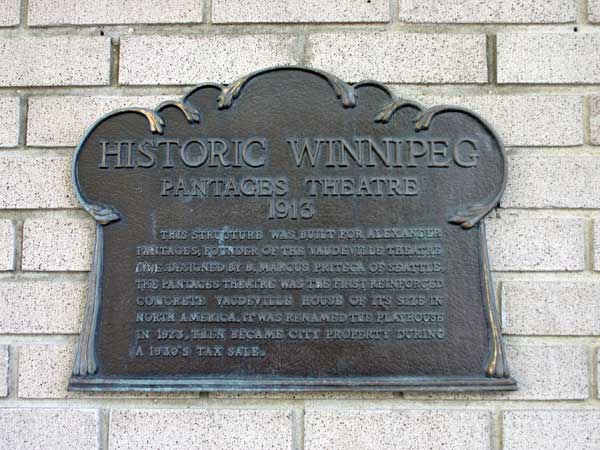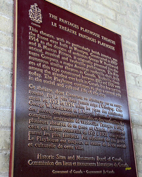 Designed by B. Marcus Priteca of Seattle, construction of this structure between 1913 and 1914 by contractor James McDiarmid was supervised by local architect George William Northwood. The Pantages Theatre, named for businessman Alexander Pantages, was the first reinforced concrete Vaudeville house of its size in North America. It was renamed the Playhouse in 1923, then became City property during a 1930s tax sale. In 1985, a plaque was installed in its lobby, recognizing its designation as a National Historic Site by the Historic Sites and Monuments Board of Canada. It is also a municipally and provincially designated historic site. Restoration of the theatre building was given a Conservation Award by Heritage Winnipeg.
