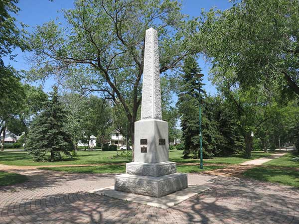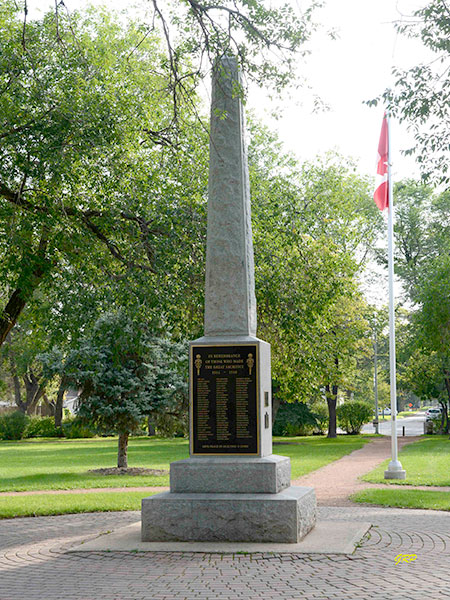 Cared for by the Transcona Royal Canadian Legion No. 7, the cenotaph was originally built and dedicated in October 1931, to commemorate Transcona community members who lost their lives in the First World War. A formal unveiling followed on Armistice Day (11 November) of that same year. The monument is comprised of British Columbia grey granite and was assembled by the Memorial and Tile Company (of Winnipeg) at a cost of around $1,500. Its original location was on Regent Avenue (now Regent Avenue West) at the intersection of Oxford Street (now Day Street). It was later relocated to Park Circle. Plaques honouring Second World War and Korean War casualties and recognizing peacekeepers were added. The cenotaph was renovated and rededicated in June 2001.