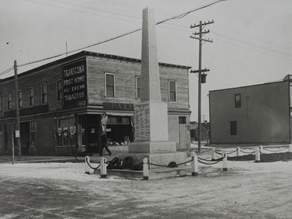 Transcona War Memorial, as seen from the southwest corner of Regent Avenue West and Day Street (February 1935) by C. Frank Munton