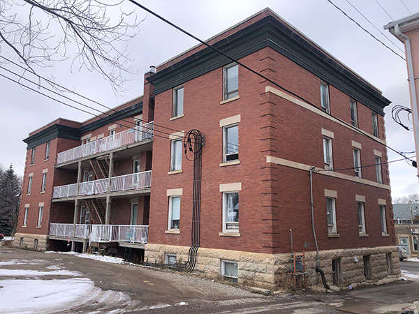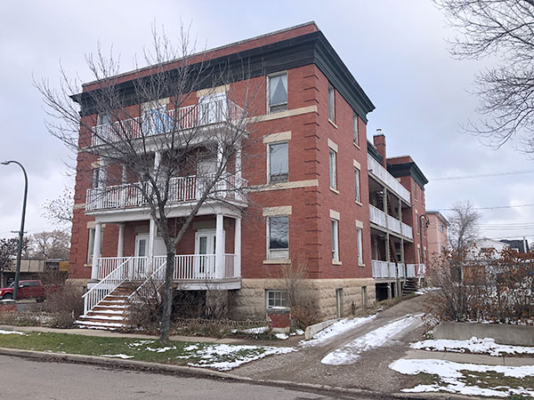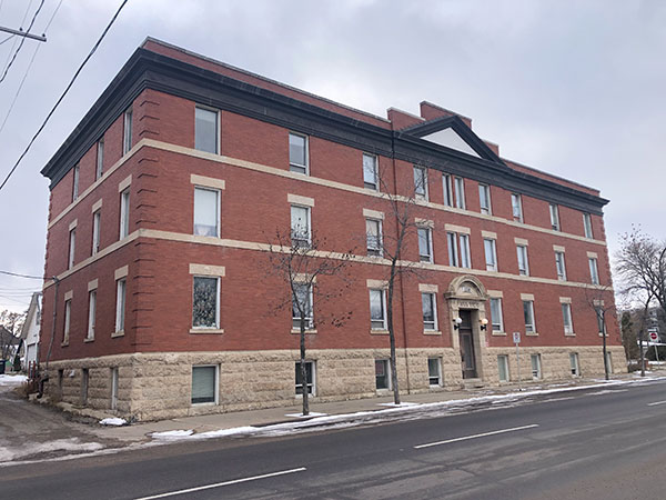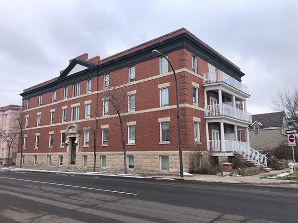 This three-storey brick and stone building on Princess Avenue in Brandon was designed by local architect Thomas Sinclair and constructed in 1912 by builder Edwin Charles Higgens. It contained 26 apartments in its original configuration.