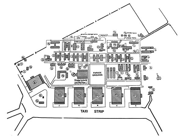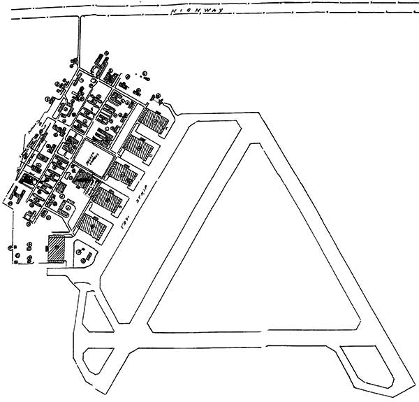Map of the No. 7 Bombing and Gunnery School, showing six aircraft hangars adjacent to a taxi strip, from which training aircraft could travel to any of three runways (July 1940)