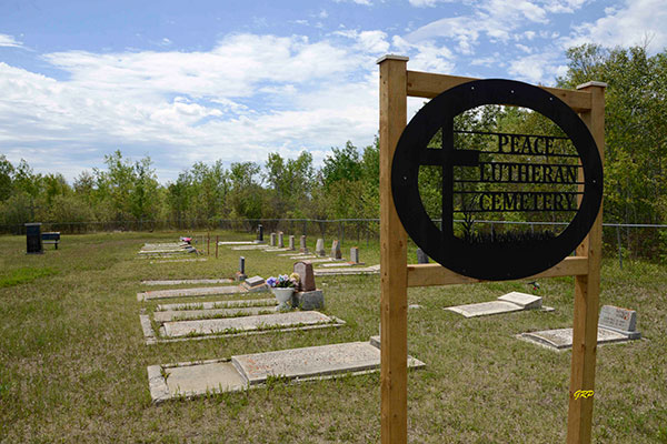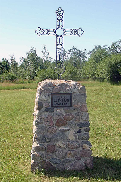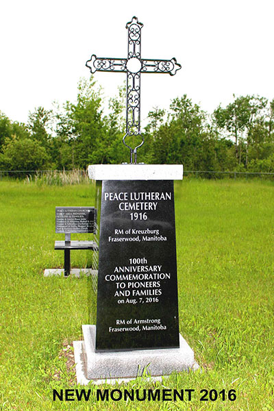 This cemetery in the Rural Municipality of Armstrong, associated with the Peace Evangelical Lutheran Church situated about two miles to the northwest, was established in 1916 on an acre of land donated by Gustav and Sahrafina Rattai when their three-year-old son Reinhold passed away. A stone monument was built before 1980 by Herb Jung and the cross was donated by August Singbiel. A new black granite monument was erected in 2016 to commemorate its 100th anniversary.