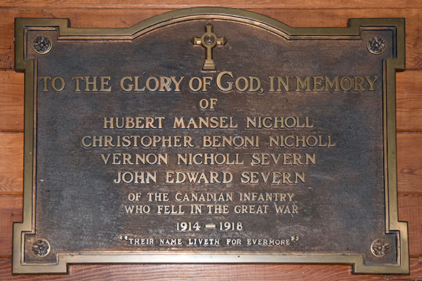First World War commemorative plaque inside St. Luke’s Pembina Crossing Anglican Church (May 2019)