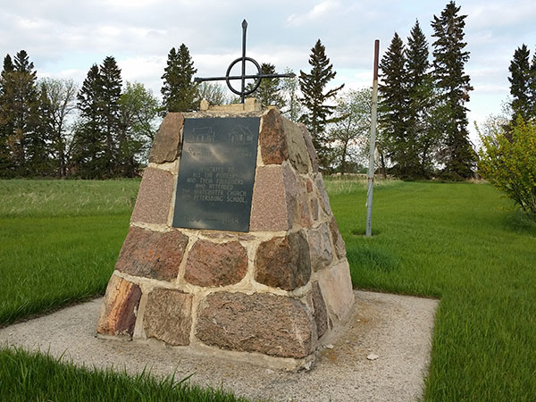 This site, surrounded by trees with a rusting swing near a monument dedicated in 1988, was the location of Petersburg School, at Whitewater in what is now the Municipality of Boissevain-Morton. The school district was formally established in May 1893, with the classes beginning in 1895 in a one-room schoolhouse constructed using locally manufactured bricks. The original building was later replaced by a wood frame structure. The school operated until January 1968. As of the early 1990s, the former school building was still present at the site but is now gone. The monument also commemorates Whitewater Church, which stood here from 1904 to 1957.
