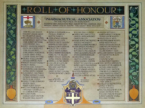 An Honour Roll in the Faculty of Pharmacy building at the University of Manitoba campus in downtown Winnipeg, prepared by artist Lionel LeMoine Fitzgerald, lists those with connections to the Pharmaceutical Association of Manitoba who were killed during service in the First World War.