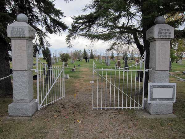 Plaques on the gateposts into this cemetery, near Pierson in the Municipality of Two Borders, commemorated local residents killed during military service. Dedicated at a ceremony on 3 August 1931, there were missing at the time of a July 2025 site visit.
