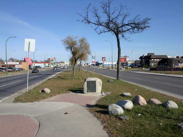 This monument, which marks the northern end of the Pine to Palm Highway, was erected on 12 November 1974 by the Royal Trust Company, commemorating its 75th anniversary and the City of Winnipeg Centennial.