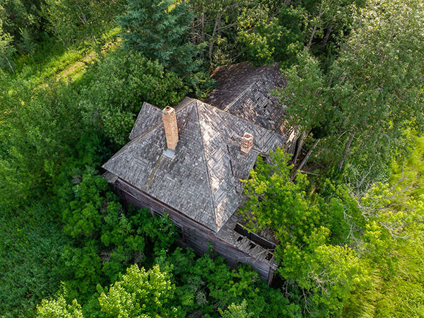 Aerial view of the former Canadian National Railway station at Piney (July 2023)
