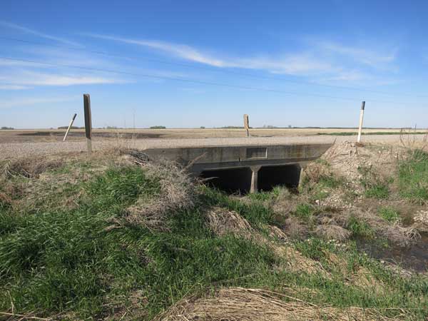 This concrete culvert bridge along a portion of highway 255 in the Rural Municipality of Pipestone (N3-9-26W) was constructed between 1921 and June 1922 by the construction firm of Jackson & Charles, at a total cost of $1,095.