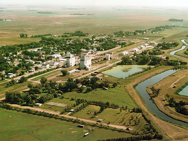 Aerial view of Plum Coulee grain elevators (1990s)