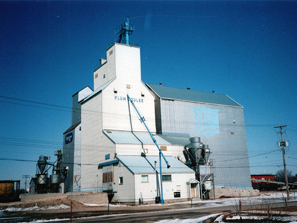 A wooden grain elevator in Plum Coulee, on the CPR La Riviere Subdivision in the Municipality of Rhineland, was purchased from McCabe Grain in September 1968.