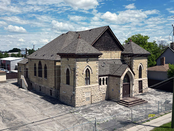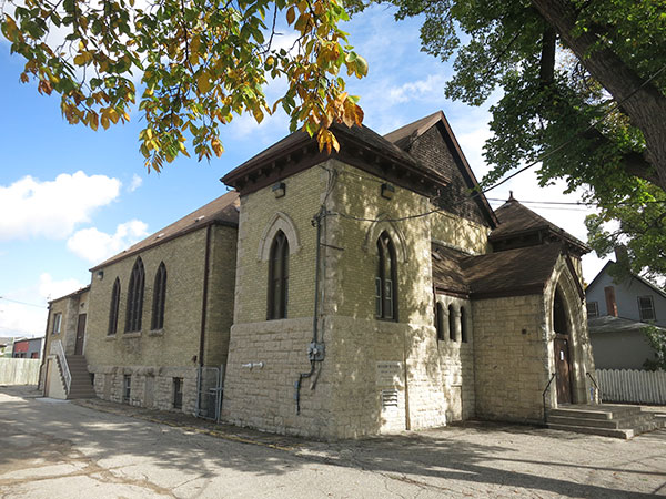 This brick and stone building in the Point Douglas area of Winnipeg was constructed in 1905 on a design by local architect James McDiarmid. Originally occupied by a Presbyterian congregation, it is now the home for a Roman Catholic church. A nearby building used originally as a hall is now home to the Pilgrim Baptist Church.