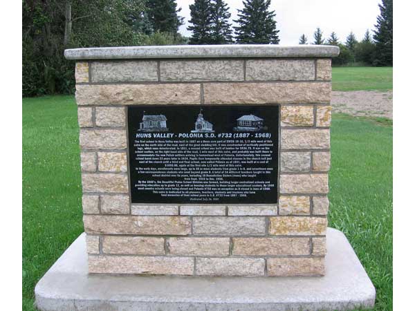 Formally established as Hun’s Valley School in December 1886, the first school was built in 1887 on a three-acre part of SW28-16-16 west of the Principal Meridian, one-half mile west of this monument on the north side of the road, east of the good sledding hill, in the Rural Municipality of Rosedale. It was constructed of vertically positioned logs, which soon deteriorated. In 1911, a second school was built of lumber for $936.75. It was on the school section, on the right side of the road, one mile west of this cairn, and probably was built there to accommodate the new Polish settlers arriving to homestead west of Polonia. This second school burned down in 1934. Pupils then attended classes temporarily in the church hall just east of the church until a third and final school, now called Polonia School as of 1921, was built at a cost of $1,690, again at the first site one-half mile west of this cairn.