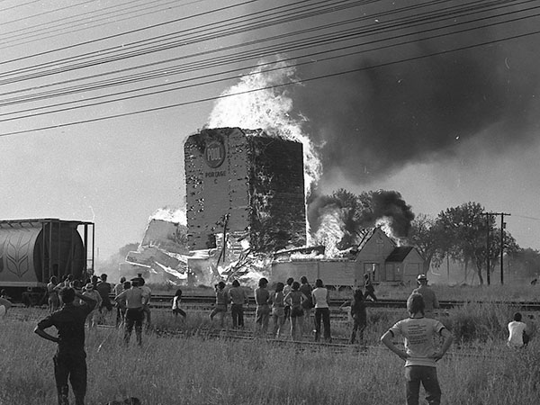Manitoba Pool grain elevator C at Portage la Prairie on fire (August 1976)