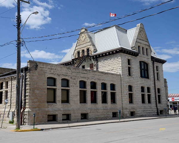 The former Dominion Post Office in Portage la Prairie was designed by Thomas L. Fuller, one of Canada’s foremost architects and the designer of Canada’s first Parliament Buildings. The building is an example of Fuller’s interpretation of the Romanesque Revival style. The 2½-storey hammer-faced limestone building features a steep mansard roof and central gable. Originally, the ground floor housed the Post Office while the upper floor held the Customs and Revenue Office. Political controversy in Ottawa delayed construction, but the building was finally opened in 1898. In 1920, an addition was made on the south side. The building became the Portage la Prairie City Hall in 1960, when a new post office opened on the next block along Saskatchewan Avenue, and the old building has also provided space over the years for the Magistrate’s Court, Youth Court, RCMP detachment (with its jail cells), library, and arts centre.
